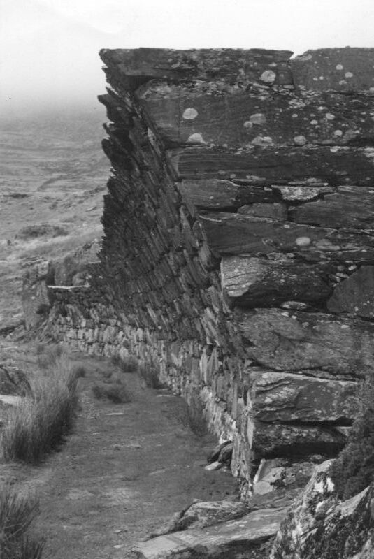 Well over 100 years old the wall overhangs its base by around 1.5m, without a stone being out of place. This has been achieved through the use of massive (up to 2.5 m long) corbelled slate slabs. The wall 'supports' a waste slate heap, with its original function having been to prevent waste