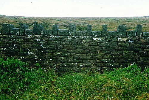 Here there is much more variation in stone size within any course than for more regular stone. Dips between stones are either levelled with small thin stones or utilised for fitting thicker stones in the next course, similar to the method employed for cloddiau (p.xx). <<YOUR EARTH etc. p.8.12>>. As with cloddiau whilst the coursing is normally visible when looking directly at the wall's face it is often far more distinct when viewed from an angle.